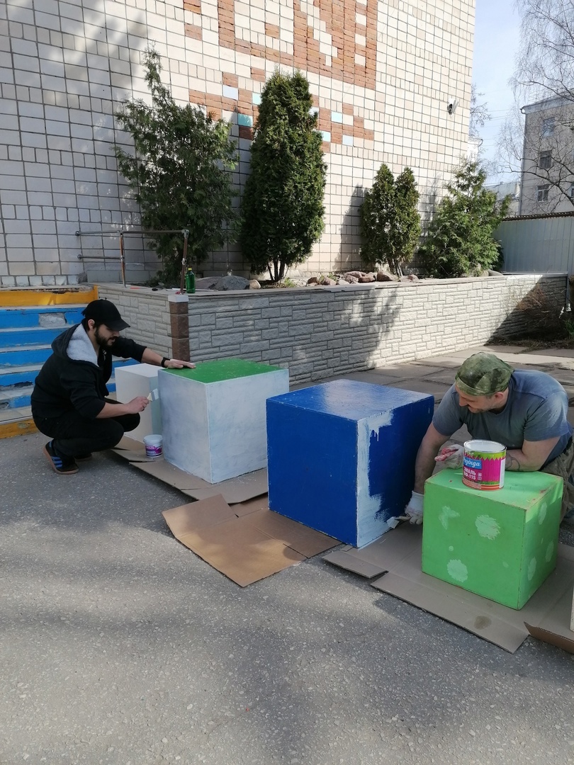 А мужчины еще и красили кубики для будущего выступления театральной студии.