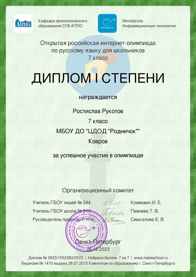 Рукотова Ростислава с дипломом 1 степени
