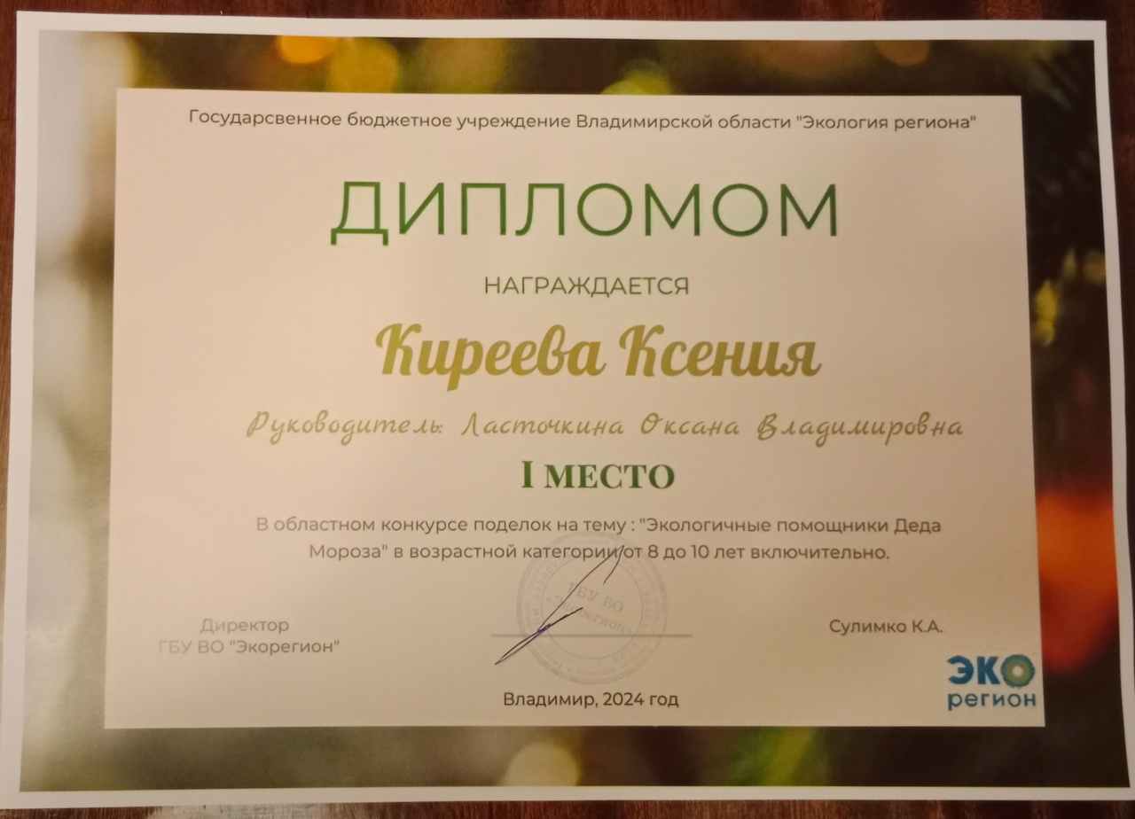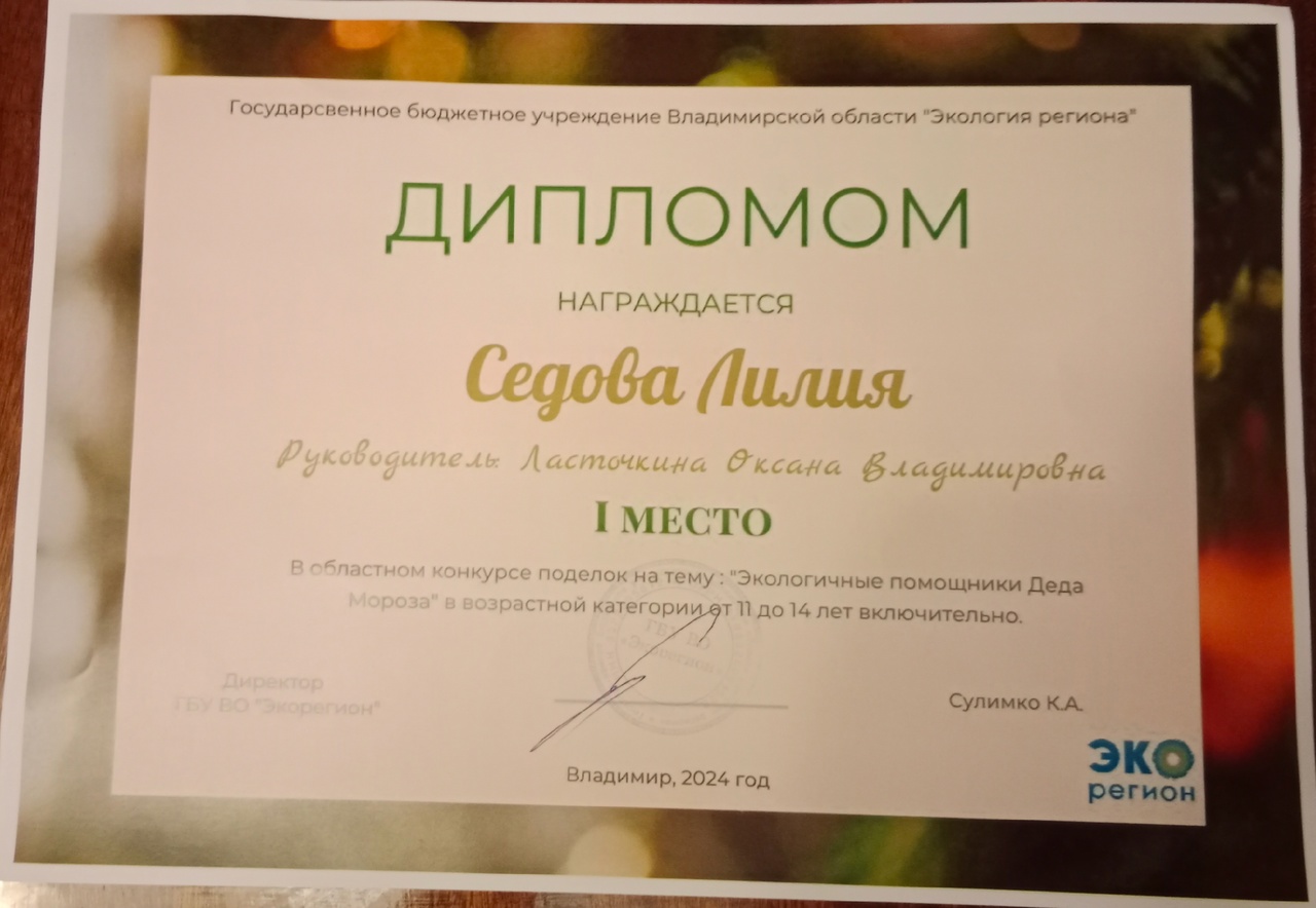 Кирееву Ксению и Седову Лилию с победами в своих возрастных категориях в областном конкурсе поделок на тему "Экологичные помощники Деда Мороза".