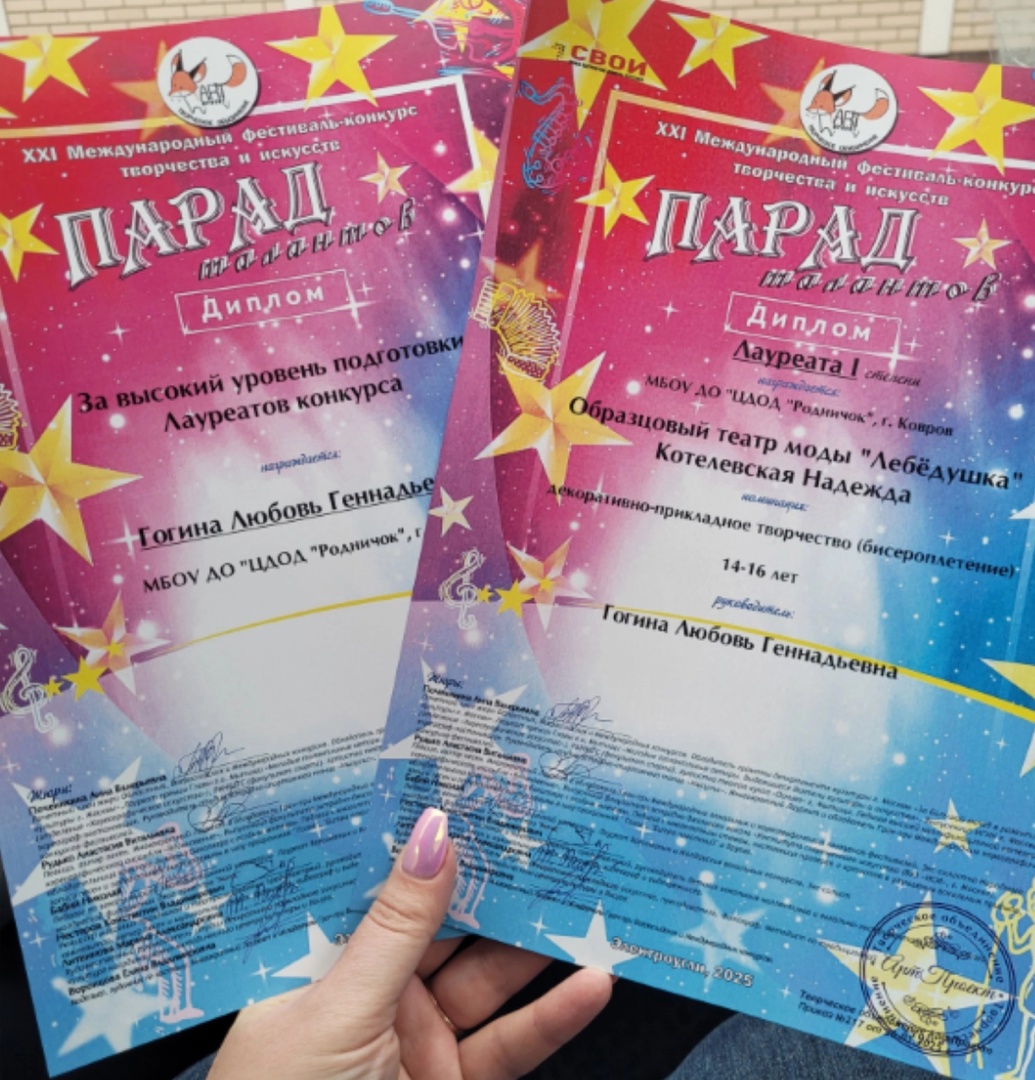 Котелевскую Надежду (педагог: Гогина Любовь Геннадьевна) с победой в Международном фестивале-конкурсе творчества и искусств "Парад талантов" (г.Электроугли, Московская область).