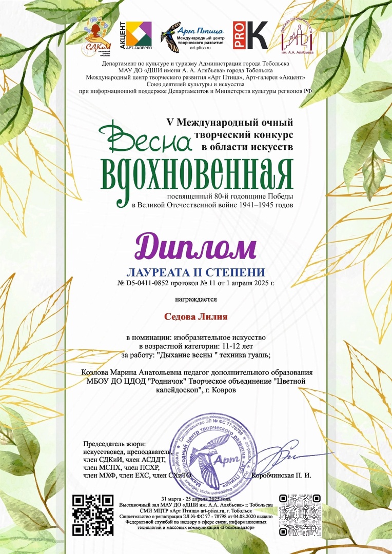 с победой на Международном творческом конкурсе в области искусств "Весна вдохновенная".