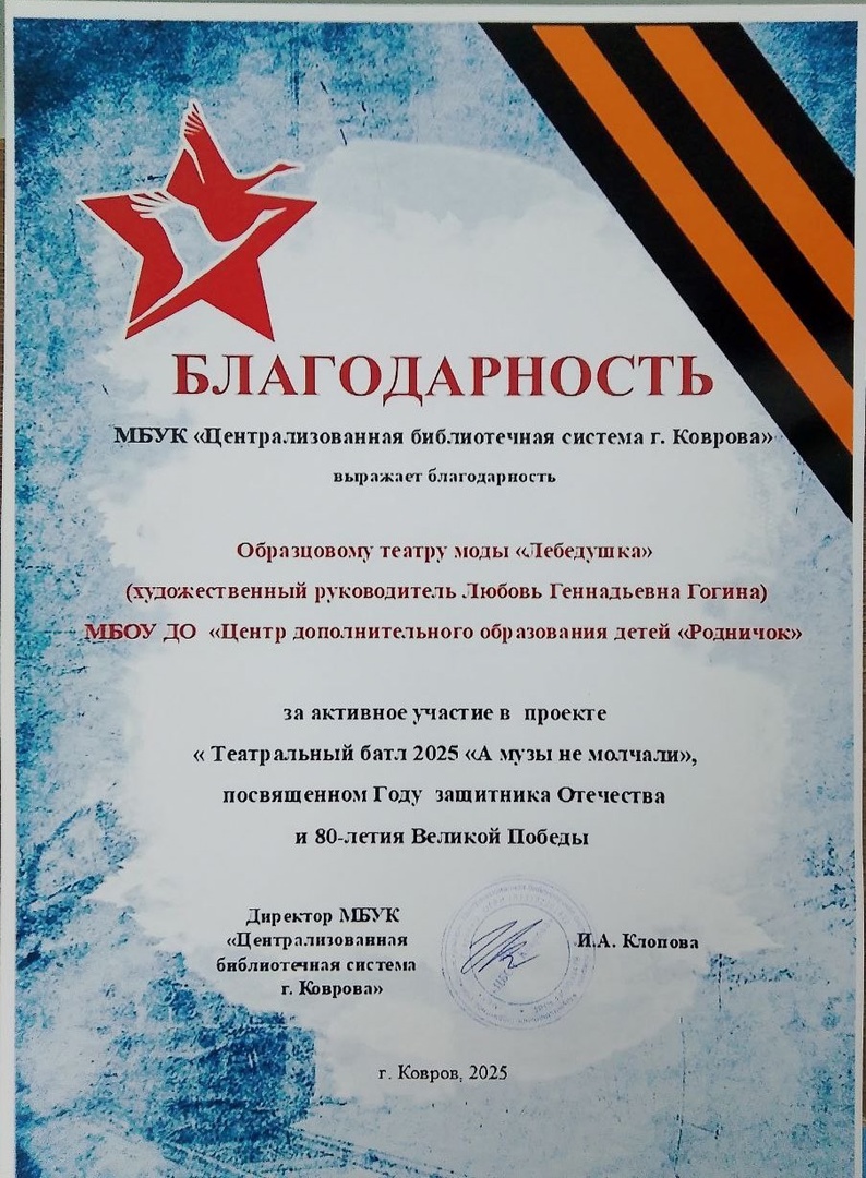 "Театральный батл - 2025 " - "А музы не молчали...", посвящённому Году Защитника Отечества и 80-летию Великой Победе, организованным МБУК "Централизованная библиотечная система города Коврова".
