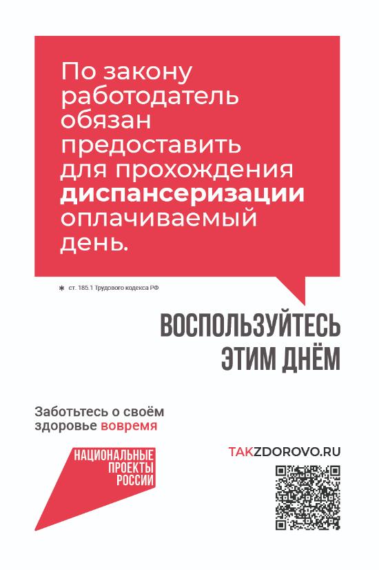 В соответствии с письмом Правительства Владимирской области от 20.03.2025 № 01/01-11-359 в целях проведения информационной кампании «Диспансеризация» в рамках национального проекта «Продолжительная и активная жизнь», широкого информирования жителей города Коврова о возможности прохождения бесплатной диспансеризации, Управление образования администрации города Коврова информирует о доступности бесплатного профилактического обследования.
