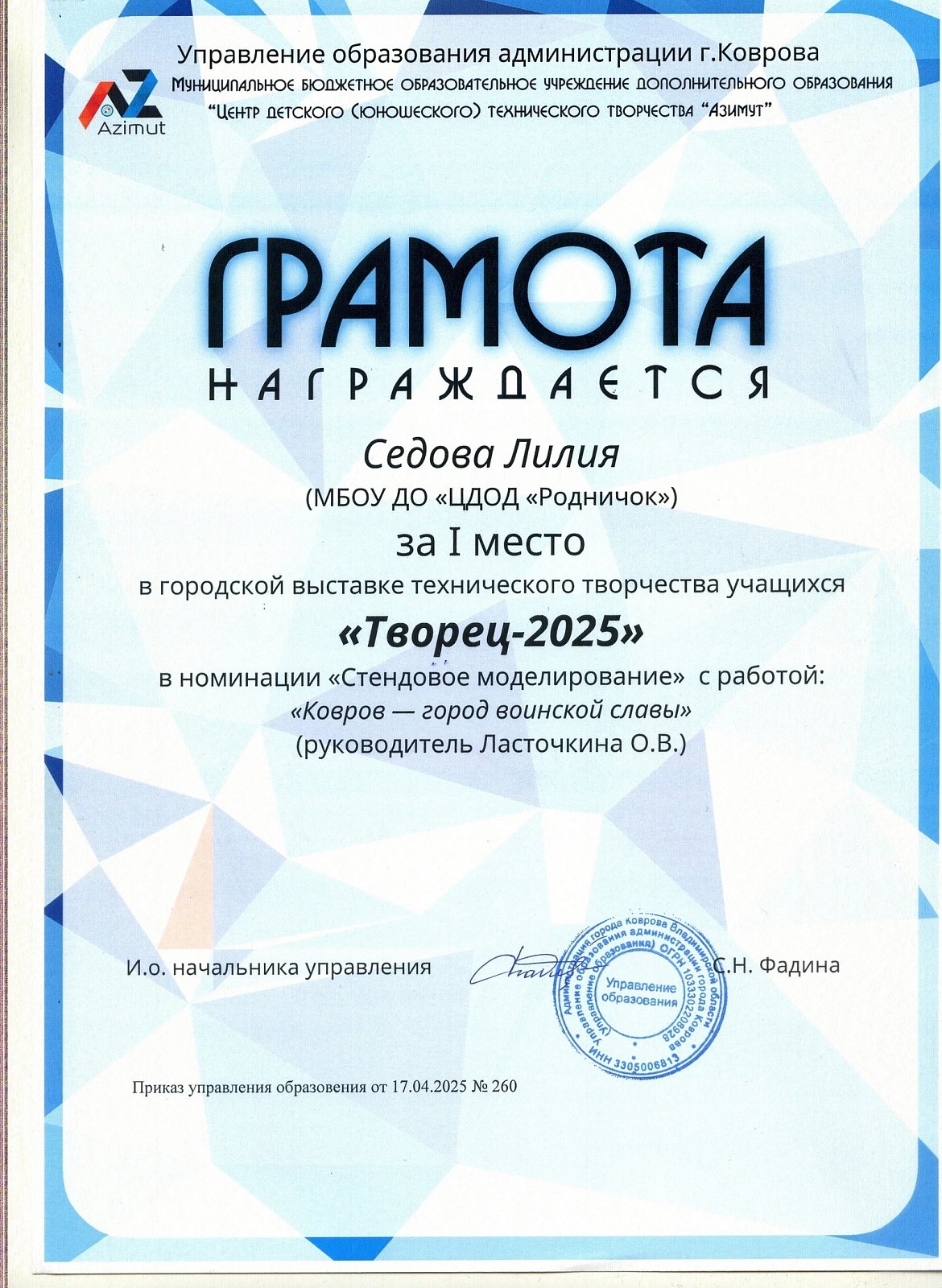 - Седова Лилия - 1 место.