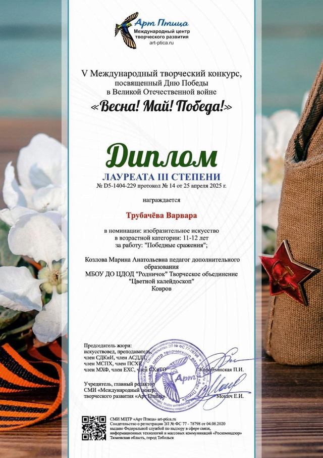 Трубачёву Варвару- Лауреата 3 степени Международного творческого конкурса "Весна! Май! Победа!"