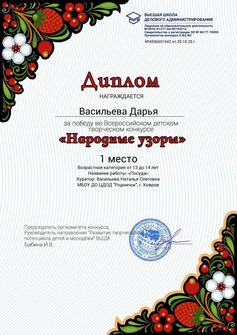 с ПОБЕДОЙ во Всероссийском детском творческом конкурсе "Народные узоры".