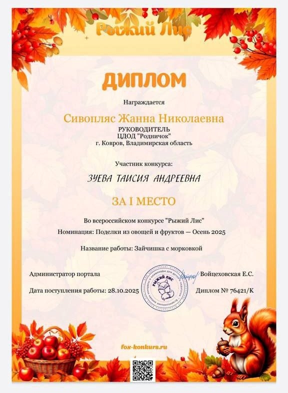 в номинации "Поделки из овощей и фруктов - Осень 2025" с работой "Зайчишка с морковкой".