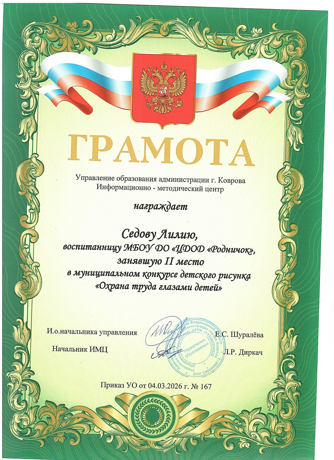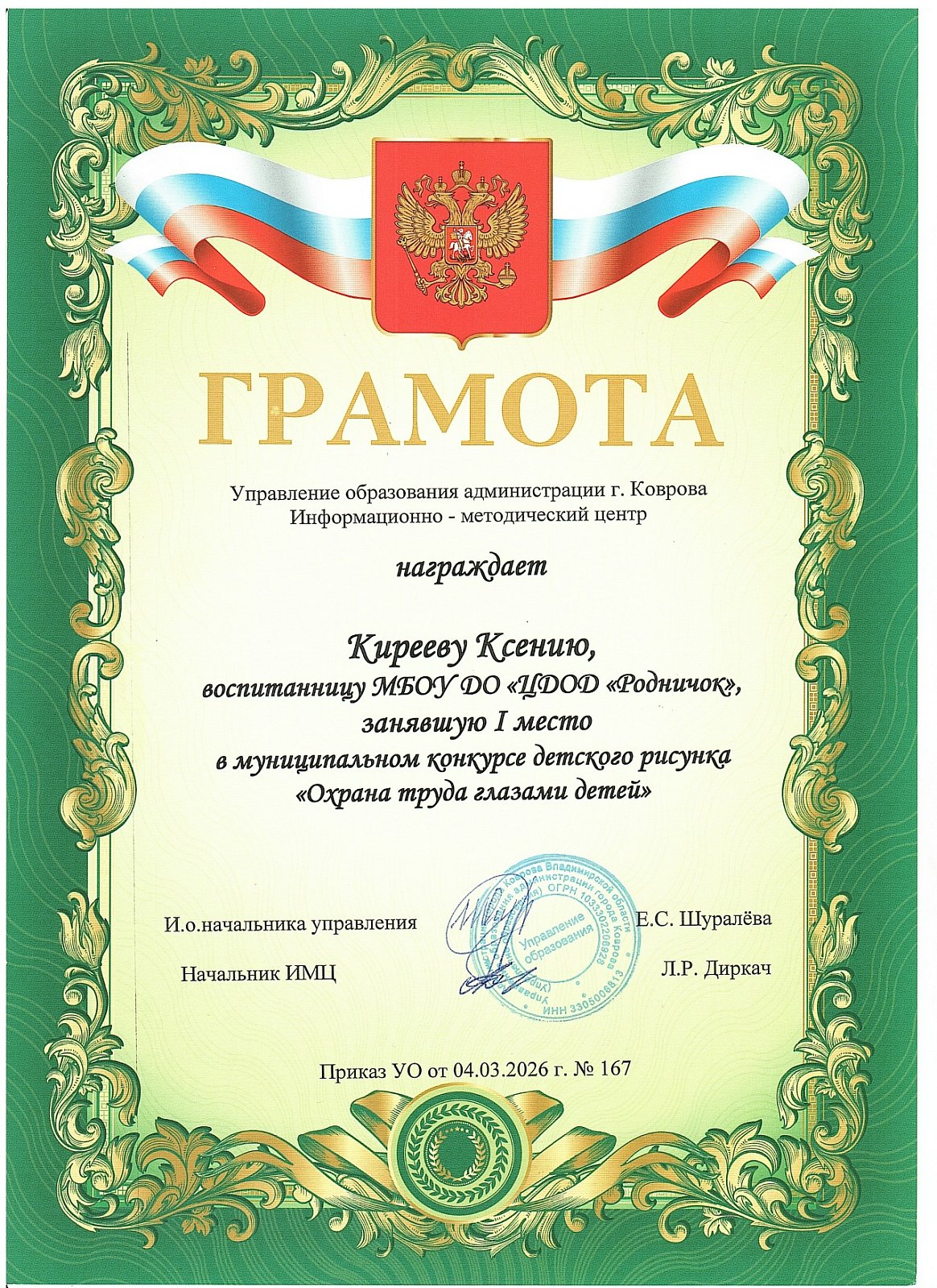 занявших 1 и 2 место в муниципальном конкурсе детского рисунка "ОХРАНА ТРУДА В ПИЩЕВОЙ ПРОМЫШЛЕННОСТИ ГЛАЗАМИ ДЕТЕЙ". Их рисунки примут участие в региональном этапеданного конкурса! Пожелаем удачи!