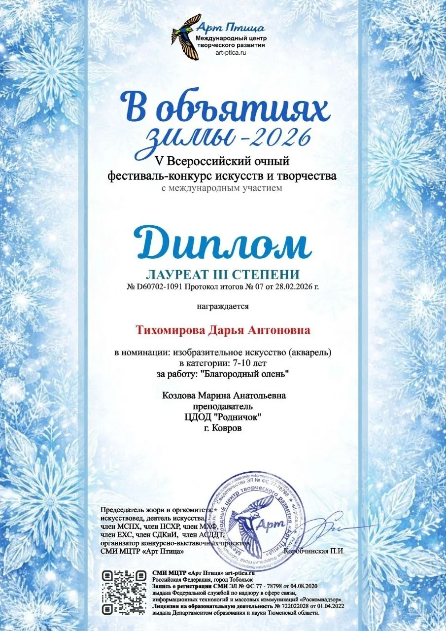 - Тихомирову Дарью - диплом Лауреата 3 степени.