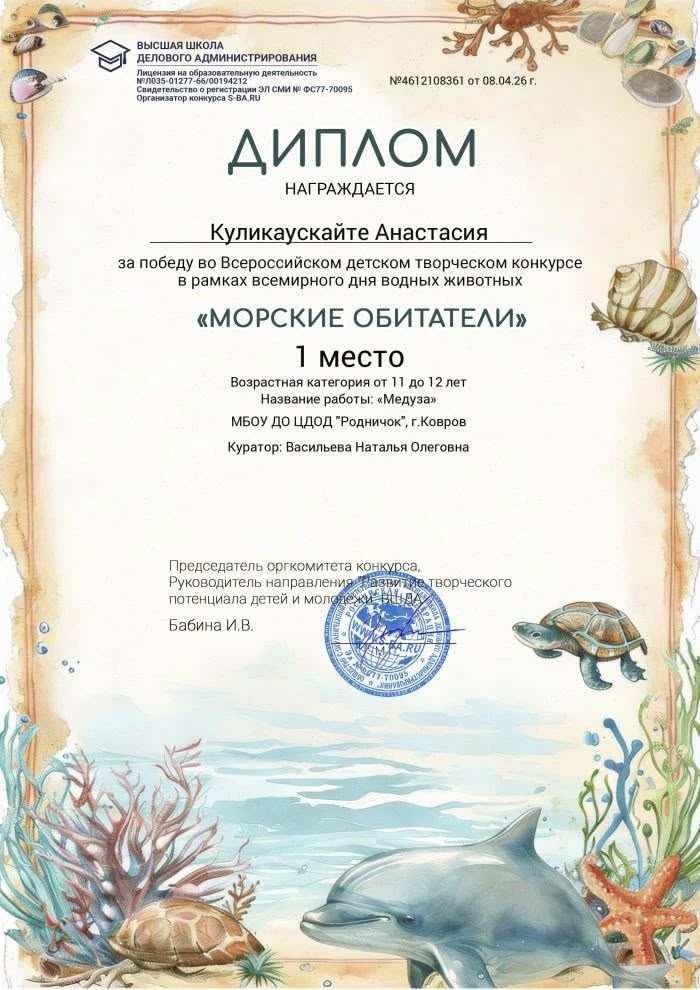 с ПОБЕДОЙ на Всероссийском детском творческом конкурсе "Морские обитатели".