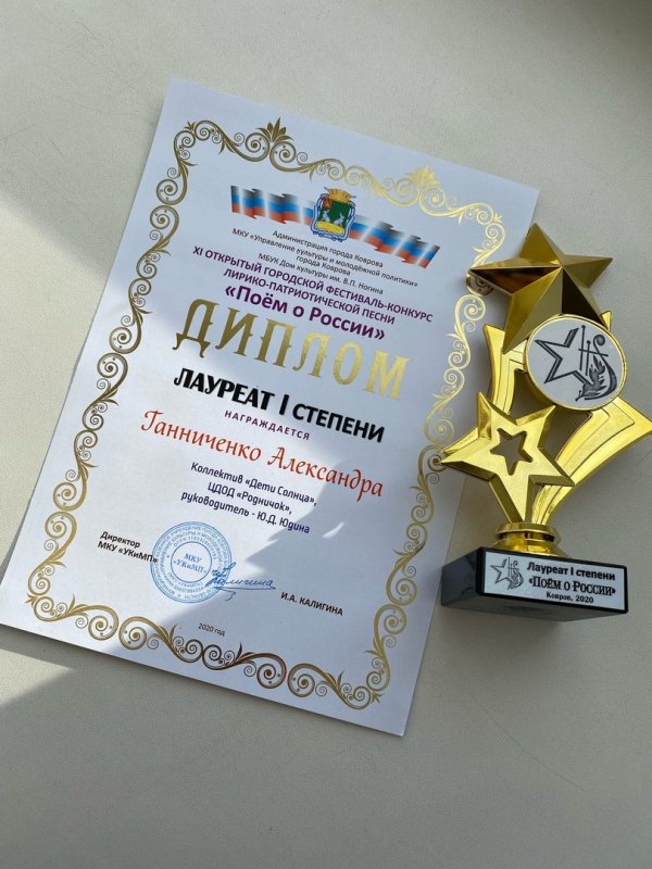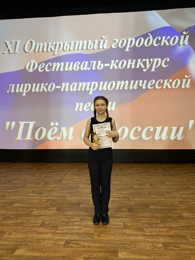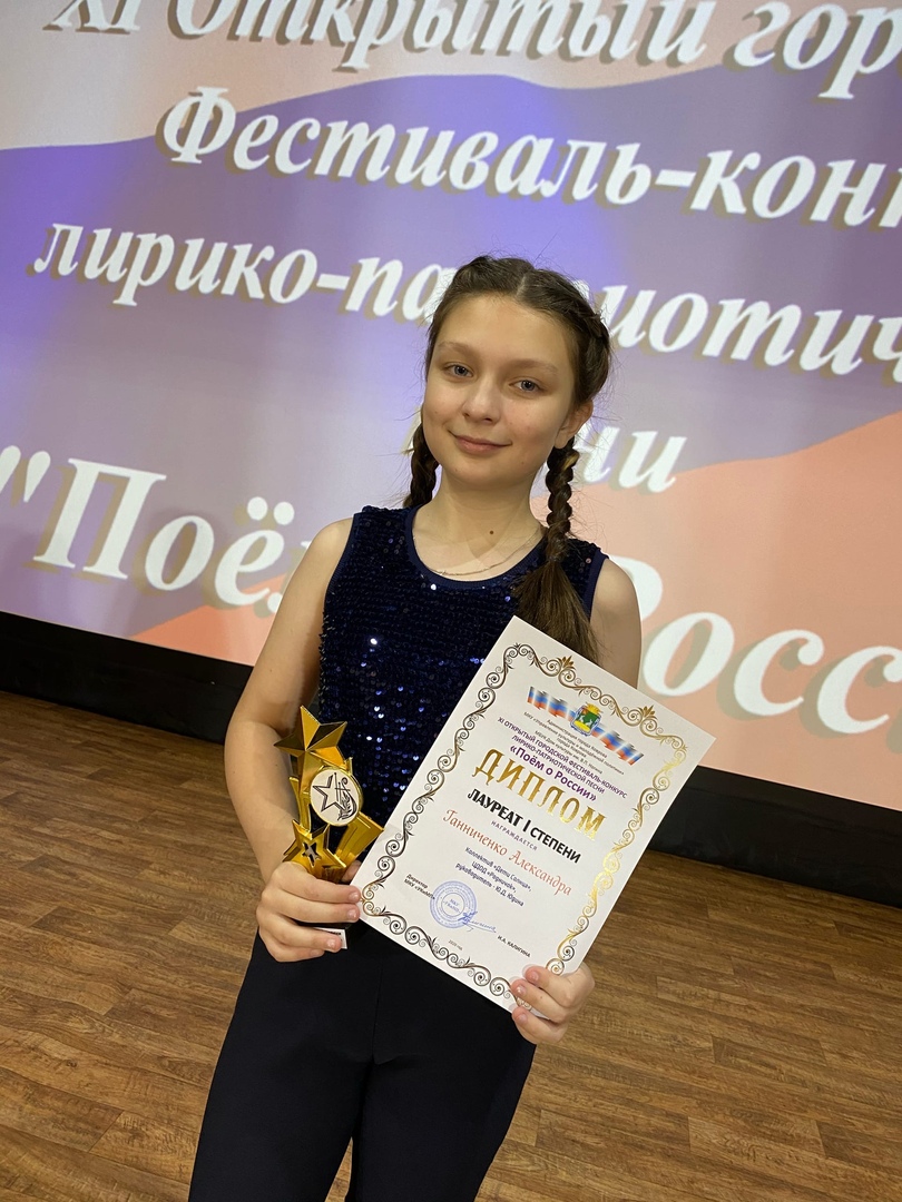 Ганниченко Александра (студия вокала "Дети солнца" - руководитель Юдина Юлия Дмитриевна) представила песню "Россия" и получила диплом Лауреата 1 степени, с чем мы ее и поздравляем!