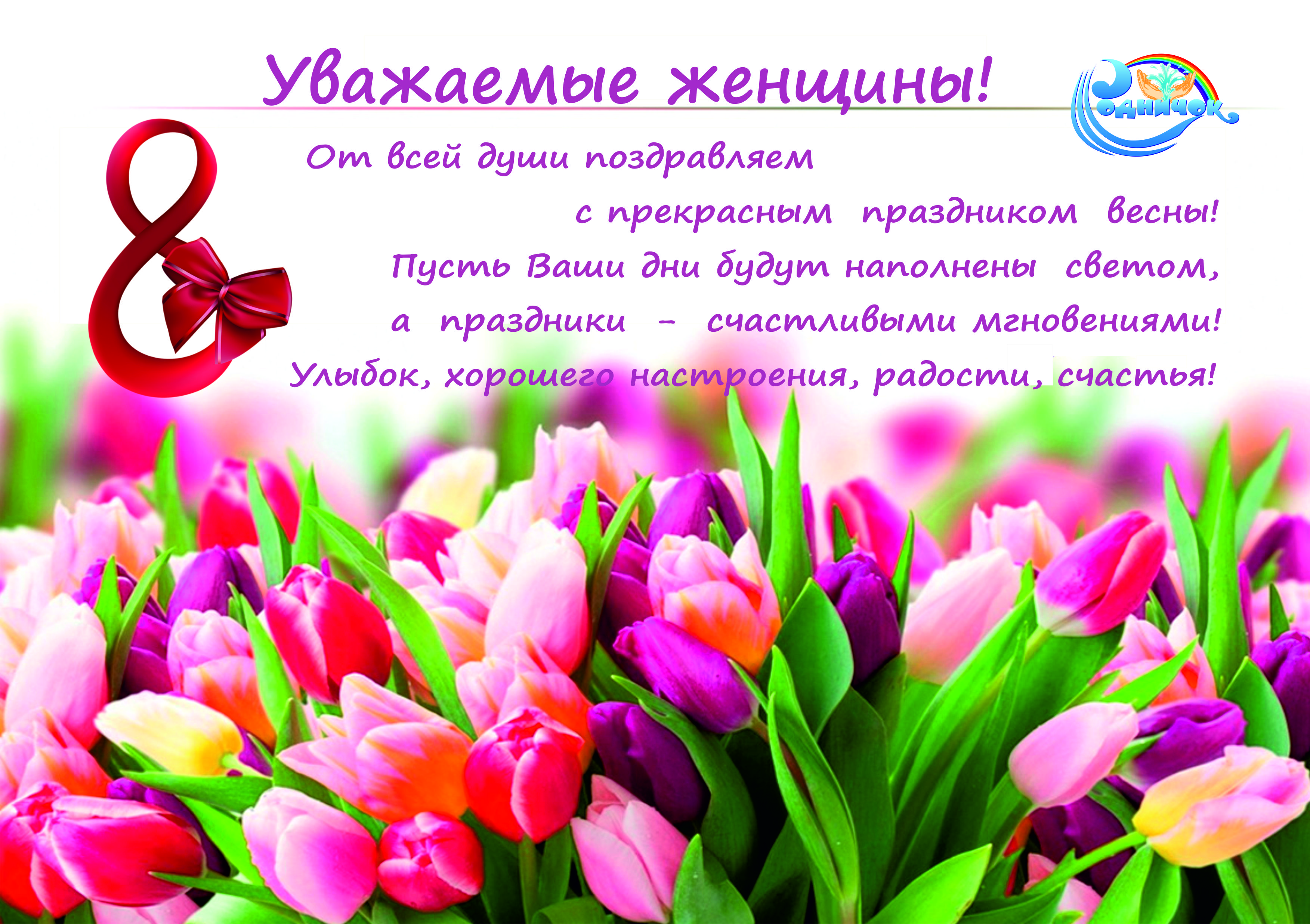 В преддверии праздника 4 марта в ЦДОД «Родничок» состоялся концерт, посвящённый ЖЕНСКОМУ ДНЮ. Зал был наполнен атмосферой весеннего настроения, улыбками и радостью. Выступление детей прошло с большим успехом. Каждый ребенок подарил зрителям частичку себя, своего настроения и, конечно, зрители не остались равнодушными к выступлению детей. Их глаза светились от радости, счастья и гордости за своих детей. Творческая атмосфера, которая царила в зале в этот день, ощущение прихода весны дала людям столько положительных эмоций, что хочется верить в то, что все наши светлые надежды на счастье, радость и добро обязательно сбудутся!