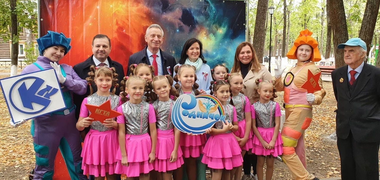 Фотозона манила разной цветовой гаммой: звёздное небо, ростовые куклы Фиксики и логотипы учреждений.