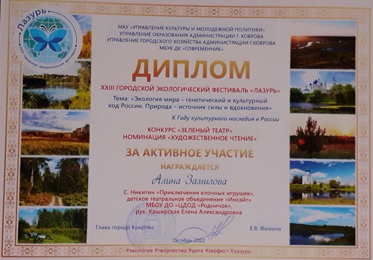 Алина в номинации «Художественное слово» исполнила отрывок из сказочной повести нашего писателя – земляка Сергея Никитина «Приключения ёлочных игрушек» и получила Почетный Диплом фестиваля.