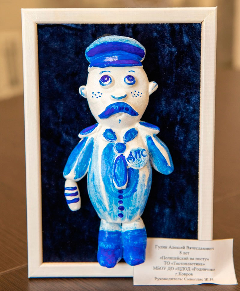 Алексей посещает объединение «Тестопластика» и под руководством педагога Жанны Николаевны Сивопляс подготовил работу «Полицейский на посту» и с достоинством представил «Родничок», город Ковров и родной край на Всероссийском конкурсе.