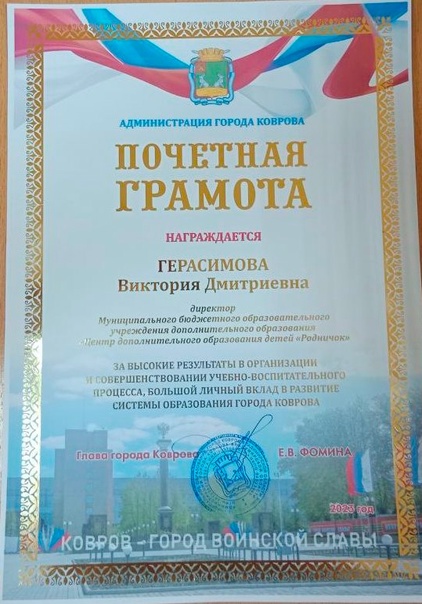 совершенствовании учебно-воспитательного процесса, большой личный вклад в развитие системы образования города Коврова.