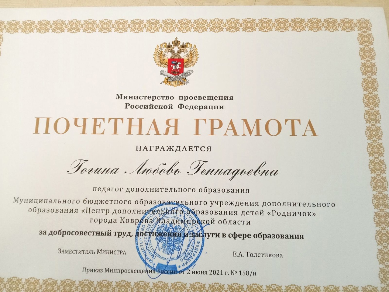 Любовь Геннадьевну Гогину с вручением почетной грамоты Министерства просвещения Российской Федерации!