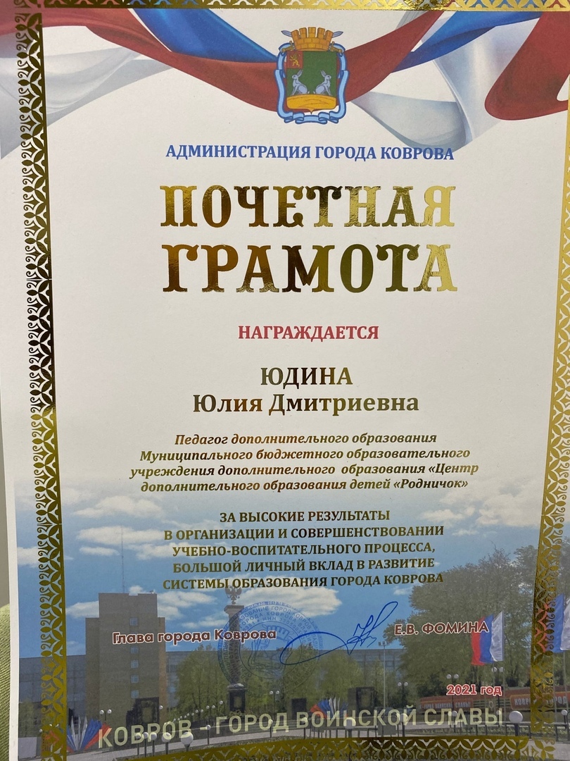 Юлию Дмитриевну Юдину с вручением Почетной грамоты Администрации города Коврова!